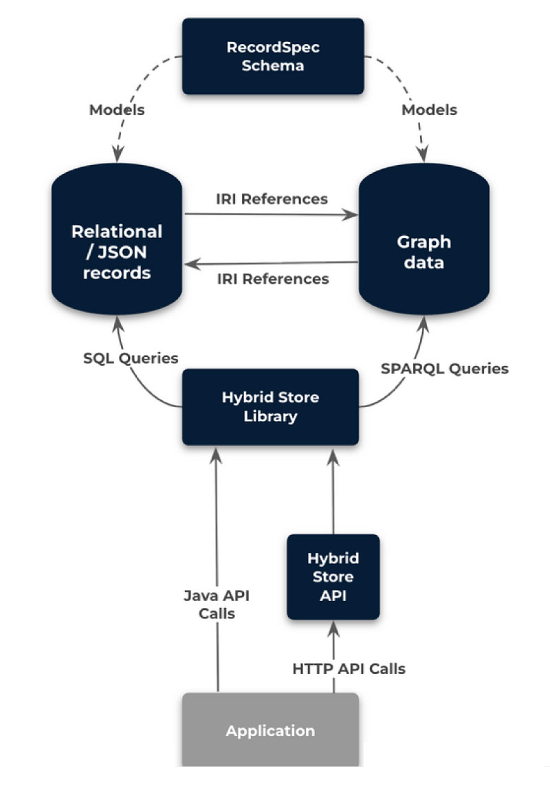 The Hybrid Store provides a solution that brings together the graph-management capabilities of Apache Jena Fuseki for metadata, and the high-volume relational and JSON record management capabilities of Postgres. A single query language allows developers and API users to construct queries that seamlessly cross relational and graph datastore and returns a unified result set with elements of data taken from either store or both.